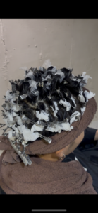 細かく分け取った髪を、ピンでひとつひとつ留めていくスタイル。